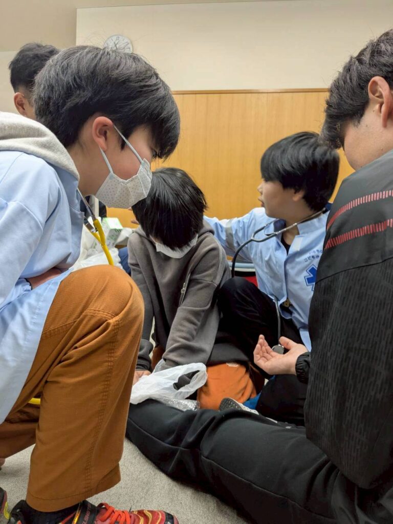 実際の活動を想定した訓練に参加。消防士の人助けのマインドを疑似体験するとともに、前の時間に訓練した「応急処置」を実際に使いながら緊急時の動き方やチームの連携を体感しました。
